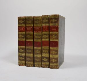 5 vol. in-8, veau marbré vert ép., dos lisses ornés (passés au havane), p. de titre et de tomaison en mar. rouge, fine guirlande dorée encadrant les plats, tr. marbrées.