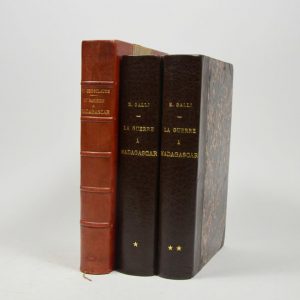 On y ajoute : GALLI (H.), La Guerre à Madagascar. Histoire anecdotique des expéditions françaises de 1885 à 1895. Paris, Garnier frères, sd. 2 vol. in-4 demi-maroquin brun à coins moderne, dos lisses, titre et tomaison dorés (N. Allainmat, 2010). 121 gravures en couleurs par L. BOMBLED, cartes et plans. -- 120 / 150 €