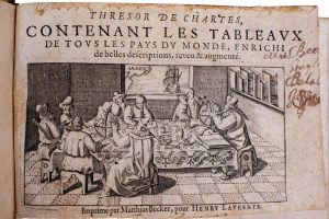 Une des premières éditions françaises du Caert-Thresoor du libraire et éditeur Barent Langenes (publié pour la première fois en hollandais en 1598 à Middelbourg), imprimée par Matthias Becker pour Henry Laurentz, le successeur de Cornelis Claesz.