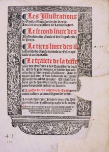 LE MAIRE DE BELGES (Jean). Les illustrations de Gaule et singularitez de Troye. Auec les deux epistres de Lamant Uert. Le second liure des illustrations de Gaule et des singularitez de Troye. Le tiers liure des illustratiôs de Gaule : intitule de Frâce oriêtalle et occidentalle. Le traicte de la difference des Scismes et des Concilles de leglise. Et de sa preeminence et utulite des concilles de la saicte eglise Gallicane. Avec la uraye histoire et non fabuleuse du Prince Syach Ysmail dit Sophy. Et le saufconduyt que le Souldan baille aux Francoys pour frequenter en la terre saincte. Lepiste du roy a Hector de Troye et aucunes aultres œuvres dignes de veoir. Le tout côpose par Jehan le Maire de Belges, indiciaire et historiographe de la royne. Paris, Francoys Regnault, 1528.