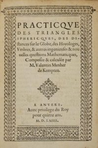 MENHER (Valentin). Practicque des triangles sphericques, des distances sur le globe, des horloges, umbres, & autres ingenieuses & nouuelles questions mathematiques […] Anvers, sn, 1564.