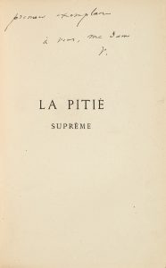 HUGO (Victor). La Pitié suprème. Paris, Calmann Lévy, 1879. In-8, chagrin bleu nuit, couvertures et dos conservés. Édition originale. UN des 5 premiers exemplaires numerotes sur papier de Chine. Deuxième couverture restaurée avec manques. On...