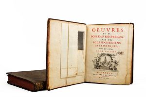 2 portraits dépliants de Boileau et de Philippe d'Orléans en frontispice du T.1. et 6 figures hors texte par Chéreau pour le Lutrin. Édition en partie originale contenant pour la première fois la satire XII (Tchemerzine, I, 769.)
