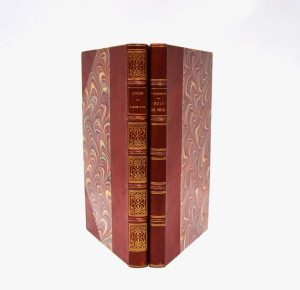 In-8 demi-maroquin rouge, dos à nerfs orné de filets dorés, titre doré, tête dorée, couv. illustrée en couleurs et dos conservés. Titre en lettres dorées dans une illustration en deux tons, vignettes en deux tons dans le texte.