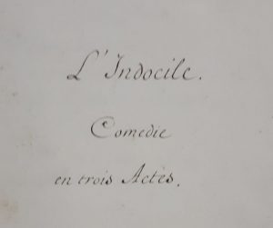 La comédie L'Indocile est bien présente dans la copie manuscrite du Duc de La Vallière ainsi que dans le catalogue Soleinne.