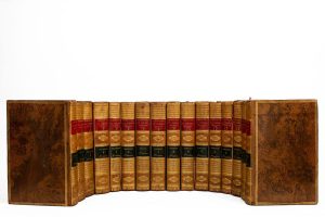 16 vol. in-8 veau raciné ép., dos lisses ornés, p. de titre et de tom. en mar. rouge et vert, grecque dorée encadrant les plats, tr. marbrées. 63 figures gravées hors texte par Perin (5+5+5+5+4+3+4+4+4+4+4+3+4+3+3+3).