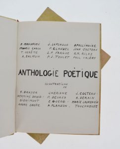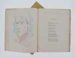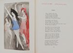 In-4 vélin ivoire, dos lisse orné du titre manuscrit en lettres capitales, premier plat orné des signatures d'artistes (Marie Laurencin, Dignimont, Chériane, Yves Brayer, Paul Claudel, Francis Carco, André Planson, Paul Delvaux, André Salmon, Touchagues, Léon-Paul Fargue, André Lhôte, Edouard Goerg) et 2 petits dessins signés de Jean Cocteau (profil) et Hermine David (paysage). Reliure d'Alvarez de Toledo, sous étui. Textes de Mallarmé, Laforgue, Apollinaire, Carco, Claudel, Cocteau, Derême, Fargue, Rilke, Salmon, Toulet, Valéry. Illustrations couleurs de Lhôte, Touchagues, Laurencin, Dignimont, Brayer, Cocteau, Devaux, Chériane, Goerg, Planson, David, Derain. Tirage à 999 ex. numérotés (n°720). Bon exemplaire dans une intéressante reliure. -- 80 / 100 €