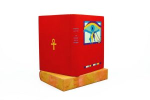 In-8 maroquin orange, dos lisse, titre en lettres bleu clair, composition égyptienne (œil d'Horus) mosaïquée en maroquin multicolore sur le plat sup., croix ansée égyptienne en mar. crème au second plat, couv. ill. conservée, sous étui à rebords (N. Allainmat, 2011).