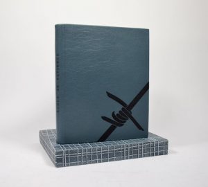 In-4 maroquin gris, dos lisse, titre en lettres noires en long, décor mosaïqué en maroquin noir au premier plat représentant un barbelé, couv. conservée, sous étui à rebords (N. Allainmat, 2014).