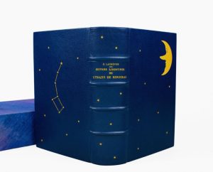2 tomes en un fort vol. in-4 maroquin bleu nuit à semis d'étoiles jaunes, dos à nerfs, titre en lettres jaunes, décor mosaïqué en maroquin jaune représentant un croissant de lune à profil "cyranesque", couv. conservées, sous étui à rebords (Norbert Allainmat, 2009).