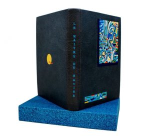 In-4 maroquin bleu gris, dos lisse, titre en lettres bleues en long, composition stylisé à décor marin mosaïquée en maroquin multicolore sur le plat sup., petit décoré mosaïqué en mar. au second plat, couv. conservée, sous étui à rebords (N. Allainmat, 2012).
