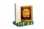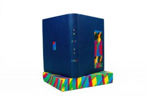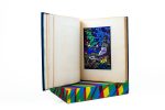 In-4 maroquin bleu foncé, dos lisse, titre en lettres multicolores, décor géométrique mosaïqué en mar. multicolore évoquant une ambiance tropicale, couv. illustrée en couleurs et dos conservés, étui à rebords (N. Allainmat, 2010).