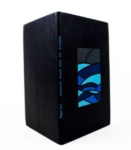 In-4 maroquin bleu foncé, dos lisse, titre en lettres bleues en long, composition stylisée mosaïquée en maroquin en tons de bleus et gris foncé représentant une vue marine sur le plat sup., couv. illustrée coul. conservée, sous étui en carton souple (N. Allainmat, 2012).