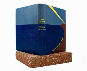 In-4 reliure à décor géométrique mosaïqué en maroquin bleu foncé, gris souris, jaune et brun, couv. conservée, sous étui à rebords (N. Allainmat).