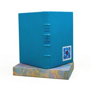 In-8 maroquin bleu ciel, dos à nerfs, titre en lettres bleues, petit décor d'inspiration médiévale peint sur parchemin intégré au premier plat, couv. ill. coul. conservée, sous étui à rebords (N. Allainmat, 2011).