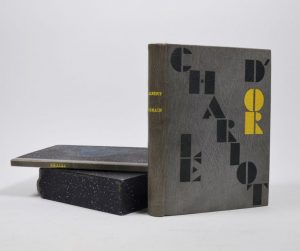 In-8 cuir "oasis" gris souris, dos lisse, auteur en lettres jaunes, titre mosaïqué sur le plat en lettres stylisées en maroquin gris anthracite et jaune or, petit décor mosaïqué au second plat, couv. ill. conservée, sous étui à rebords avec suites à part sous chemise en demi-mar. cuir (N. Allainmat, 2018).