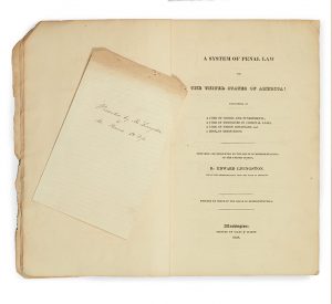 des notes par M. A. H. Taillandier. Paris, Antoine-Augustin Renouard, 1825. In-8, demi-maroquin rouge a coins, tête dorée, non rogné, couvertures conservées (Alix). Seconde édition du texte franfais, après celle donnée à la Nouvelle-Orléans en 1822. Projet de code pénal rédigé et proposé par Edward Livingston (1764-1836) pour l'État de la Louisiane. Sa version anglaise, qui devait paraitre simultanément, ne vit le jour qu'en 1824, l'année même où le code, qui n'était encore qu'à l'état de manuscrit, fut détruit dans un incendie quelques temps avant sa mise sous presse. L'auteur, qui le récrivit, avec des corrections et des augmentations, le fit finalement paraitre dans sa totalité en 1833. Le projet de Livingston, novateur, privilégiait la prévention du crime à sa répression. Bien qu'il ne füt pas retenu par l'État de la Louisiane, son influence fut néanmoins considérable sur les législations pénales du pays et en Europe. Plaisant exemplaire relié de neuf par Alix. Rousseurs.