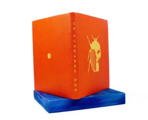 In-4 monté sur onglets, maroquin orange, dos lisse, titre en lettres jaunes au dos en long, décor de scarabée/tête de mort mosaïqué en mar. jaune paille sur le plat, pastille striée en mar. jaune paille au second plat, couv. illustrée en couleurs conservée, sous étui à rebords (N. Allainmat, 2012).