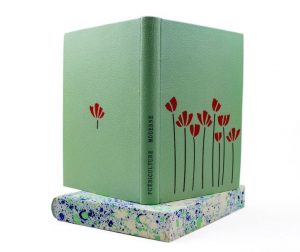 Petit in-4 maroquin vert d'eau, dos lisse, titre en lettres noires, composition de fleurs stylisées en mar. rouge et noir sur les plats, couv. conservée, sous étui à rebords (N. Allainmat, 2008).