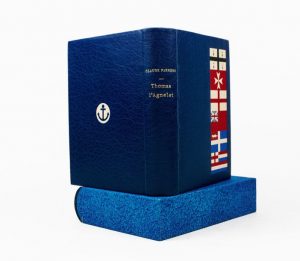 In-8 maroquin bleu marine, dos lisse, titre doré, composition mosaïquée en maroquin multicolore au premier plat reprenant des pavillons de marine, angle bleue sur médaillon blanc au second plat, couv. ill. coul. conservée, sous étui à rebords (N. Allainmat, 2010).