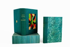 Petit in-4 maroquin vert forêt, dos lisse, titre doré, belle composition abstraite mosaïquée en maroquin multicolore sur le plat sup., pastille mosaïquée au second plat, couv. ill. coul. conservée, sous étui à rebords (N. Allainmat, 2011).