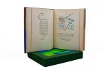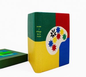 In-4 reliure en maroquin quadricolore (vert, rouge, bleu et jaune), dos lisse, titre en lettres jaunes, décor mosaïqué en maroquin multicolore au premier plat représentant un mécanisme avec un rouage cassé, couv. ill. coul. conservée, sous étui à rebords avec compositions abstraites peintes sur les plats.