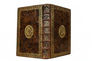 Veau marbré ép., dos à nerfs orné de caissons fleurdelysés et titre doré, armes de France dans un médaillon doré sur les plats ornés d'un large encadrement fleurdelysé, roulette sur les coupes.