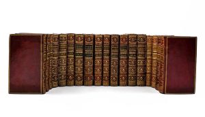 18 vol. in-12 maroquin rouge ép., dos à nerfs ornés, p. de titre et de tom. en mar. vert, triple filet doré encadrant les plats, filet doré sur les coupes, roulette dorée sur les chasses, tr. dorées.