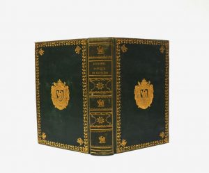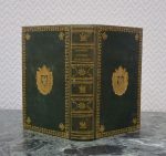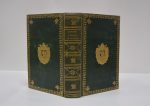 In-8 maroquin long grain vert ép., dos lisse orné d'aigles impériales dorées, titre doré, guirlande florale avec petites abeilles dorées encadrant les plats avec armes impériales dorées au centre et aigles impériales dorées en écoinçons, roulette sur les coupes, dentelle intérieure, tr. dorées, gardes de tabis rose.