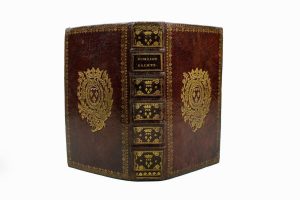 In-8 maroquin rouge ép., dos à nerfs orné de caissons aux armes, grandes armes dorées au centre des plats avec guirlande d'encadrement, tr. dorées. Frontispice.