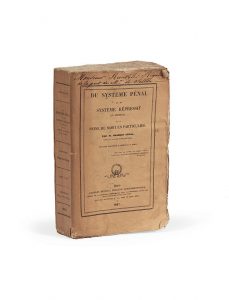 LUCAS (Charles). Du système pénal et du système répressif en général, de la peine de mort en particulier. Paris, Charles-Béchet, 1827. In-8, broché, étui moderne en toile. Édition originale, ornée d’un grand tableau dépliant hors texte....