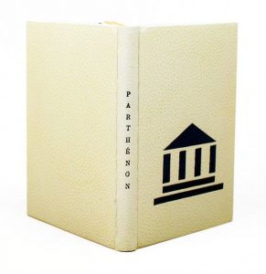 In-8 maroquin gros grain blanc cassé, dos lisse, titre en lettres bleu foncé, décor de temple grec stylisé mosaïqué en mar. bleu foncé au premier plat, couv. conservée, sous étui en carton souple (N. Allainmat, 2005).