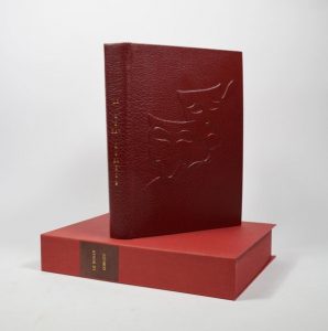 In-folio cuir façon maroquin gros grain bordeaux, dos lisse, titre doré, décor de masques antiques à froid sur le plat sup., couv. ill. coul. conservée, sous emboîtage de toile rouge (N. Allainmat, 2005).