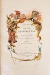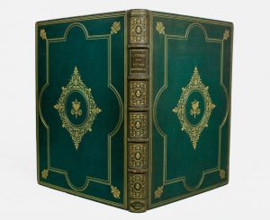 Grand in-4 maroquin vert, dos à nerfs richement orné, titre doré, lieu et date en queue, bel encadrement de filets dorés avec médaillon central fleuronné ornant les plats, double filet doré sur les coupes, dentelle int., tr. dorées, couv. illustrée en coul. conservée.