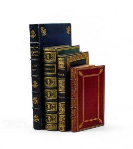 - VIRGILE, Publii Virgilii Maronis Carmina Omnia… Paris, Firmin Didot, 1858. In-16 maroquin turquoise, dos à nerfs richement orné, titre doré, triple filet doré encadrant les plats avec médaillon central richement fleuronné et initiales dorées en son centre, dentelle int., tr. dorées sur marbrure (Trautz-Bauzonnet). Édition ornée de petites photographies contrecollées en bandeaux. Très bel ex.