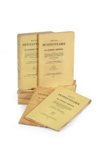PERIODIQUE CONSACREE au monde CARCERAL au XIXe siecle. Dirigée par Moreau-Christophe, inspecteur général des prisons, la revue mêle articles de fond et critiques, relations de crimes, notes bio-bibliographiques, projets de pénitenciers et reuvres littéraires. Ainsi la fameuse Histoire de Claude Gueux de Victor Hugo est-elle reproduite accompagnée d'un commentaire critique assez rude ("L'habitude de poétiser le crime a entrainé Victor Hugo beaucoup trop loin. Si son Claude Gueux est une fable admirable, c'est en même temps une insigne fausseté, un mensonge odieux”). Parmi les textes remarquables, on relève une biographie de Howard (ornée de son portrait gravé), une histoire documentée des crimes et des peines, la description du pénitencier de Philadelphie (avec un plan), le projet de Blouet, la relation complète de la discussion du projet de loi sur les prisons à laquelle participèrent Tocqueville et Beaumont, le projet de Harou-Romain (orné de la célèbre gravure d'un prisonnier à genoux dans sa cellule, gravure reprise par Foucault dans Surveiller et punir), le plan de la prison de Pentonville, etc. Un quatrième volume a paru selon le catalogue des périodiques de la Bibliothèque nationale de France. Il fait défaut à nombre de bibliothèques, dont la Bibliothèque de Genève. Bel exemplaire.