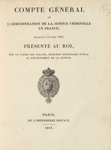 [PEYRONNET (Pierre-Denis Charles, comte de)]. Compte général de l'administration de la justice criminelle en France, pendant l'année 1825, présenté au Roi. Paris, de l'Imprimerie royale, 1827. In-4, maroquin rouge à grain long, dos à faux...