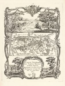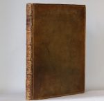 In-4, 19 x 24,5 cm, 40 ff., basane olive, triple filet doré en encadrement sur les plats, dos à nerfs entièrement orné de motifs dorés, roulette dorée aux coupes, roulette intérieure dorée, tranches dorées (reliure de l’époque). Recueil entièrement gravé avec un titre-frontispice, 21 cartes et 5 planches.
