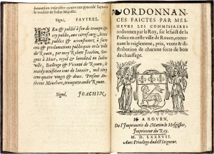 Bois gravés aux armes de France sur les titres, et aux armes de Rouen sur la dernière ordonnance (incomplète des cahiers C et D). Bois aux armes royales sur certains des derniers feuillets.