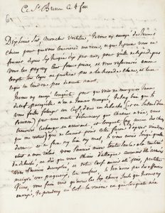 Remarquable correspondance consacrée exclusivement à la vénerie adressée par Nicolas Séguier, Marquis de Saint-Brisson (vers 1735-1809), au château de Saint-Brisson-sur-Loire, à l’un de ses amis, César Pierre Thibaud de la Brousse, Marquis de Verteillac (1729-1805) : achats ou échange de chiens et de chevaux, considérations sur les animaux et le personnel. Le fils du Marquis de Verteillac épousera Jeanne Charlotte d’Appelvoisin qui lui apportera en dot le château du Fou, haut lieu de la vénerie poitevine des XIXe et XXe siècles.