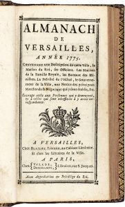 Édition originale comprenant le calendrier pour 1775, une description du château et du parc de Versailles, la composition des charges de la cour, de la maison du roi, de celles des princes et de l’administration, dont la vénerie, l’écurie, la fauconnerie, la louveterie, etc.