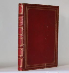 La chasse du loup. Paris, Vve Bouchard-Huzard, 1861. In-4, 19,5 x 25,5 cm, VIII + 118 pp., 1 f., 8 pl., chagrin rouge, large encadrement de filets dorés et à froid sur les plats, dos à nerfs orné de caissons dorés, chaînette dorée aux coupes, roulette intérieure dorée, tête dorée, non rogné (reliure de l’époque). Édition originale tirée à 150 exemplaires, signés par l'auteur, du premier livre de chasse français illustré par la photographie.