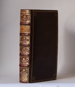 Paris, Imprimerie royale, 1768. In-12, 9 x 16,5 cm, XIV + 322 pp., un tableau replié, maroquin rouge, triple filets en encadrement et fleurons angulaires dorés sur les plats, dos à nerfs orné de caissons dorés, filets dorés aux coupes, roulette intérieure dorée, garde de soie bleue, tranches dorées (reliure de l’époque).