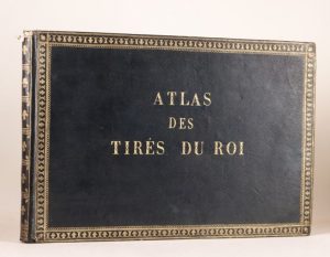 In-4 oblong, 46 x 31 cm, 2 + 64 ff., maroquin à longs grains vert, encadrement de filets et roulette dorés avec fleurs de lys aux angles sur les plats, titre doré au centre du premier plat, dos orné de faux-nerfs et de fleurs de lys dorés, tranches dorées (reliure de l’époque).