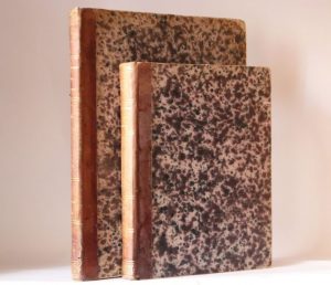 Paris, Arthus Bertrand, Mme Huzard, 1834. 2 volumes in-4 et in-folio, 20 x 26,5 cm et 25,5 x 33,5 cm, 2 ff., 678 pp. & 8 pp., 50 pl., demi-basane marron, dos lisses ornés de motifs dorés (reliures de l’époque)