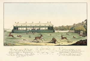 Illustré de 4 belles planches gravées de Carl Auguste Schwerdgeburth, finement aquarellées, et une planche en noir. La première planche représente « la grande chasse au cerf donnée en l’honneur de LL.MM.II… »