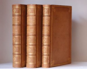 Paris, Bouchard-Huzard, 1867-1868. 3 volumes in-8, 14 x 23 cm, VIII + 494 pp. & 2 ff., 540 pp. & 2 ff., 404 pp., sanglier fauve, encadrement de filets dorés et motifs angulaires dorés sur les plats, dos à nerfs orné de caissons et de motifs dorés, double filet doré aux coupes, dentelle intérieure dorée (reliures du temps).