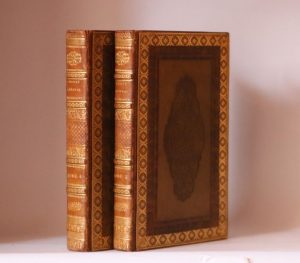 Paris, Audot, 1822. 2 volumes in-8, 13,5 x 22 cm, 2 ff., XIV + 314 pp. (chiffrées 312), 1 f., 25 + 12 pl. & 2 ff., 324 pp., 1 f. ; 11 pl. dont une repliée, veau glacé olive, plaque à froid et large roulette dorée sur les plats, dos à nerfs entièrement ornés de motifs dorés et à froid (reliures de l’époque).