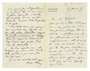 élections sénatoriales : "J'emboite le pas à Gambetta qui dispose seul de forces suffisantes pour conjurer le péril de la rentrée”... Georges Périn, 15 janvier 1875 ; le député s'insurge avec Clemenceau contre "la conduite de ceux qui tous les jours insultent un proscrit qui ne peut leur répondre, et éditent contre lui des calomnies”... Alfred MADIéR-MONTJAU, 23 mars 1879, longue lettre de 6 pages du député au sujet des poursuites du Parquet et des persécutions contre le journal La Marseillaise... Auguste VACQUérie, 25 avril 1879, il le félicite pour un article et pour son roman L'Évadé, en espérant le revoir bientot à Paris...