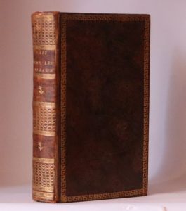 Lyon, Bruyset, 1802. In-8, 11,5 x 20, 4 ff., XVI + 284 pp., 5 pl. repliées, veau fauve raciné, dos lisse entièrement orné, grecque dorée en encadrement sur les plats, roulette intérieure dorée (reliure de l’époque). Deuxième édition, la plus complète.
